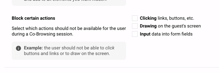 You can find the settings for co-browsing under *Add-ons* in the sidebar. There you can configure hiding sensitive information through CSS classes, as explained above. You are also able to block certain actions. For instance, if you don't want the agent to be able to click or type for the guest or draw over the guest's screen, you are able to disable it there with the click of a button!