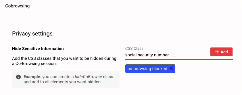 If you have any fields you would want to hide from the co-browsing agent, like fields that show credit card information or other sensitive data, you can easily do this by configuring the co-browsing session to block certain CSS classes.