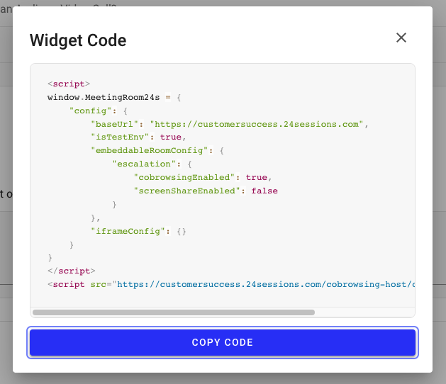 Insert the code snippet to the HTML of your webpage, preferably before the closing body sign. This ensures that loading the widget will not interfere with loading the visible content of your page. Please note that you will need to add this code snippet to every page that you want to enable co-browsing for.