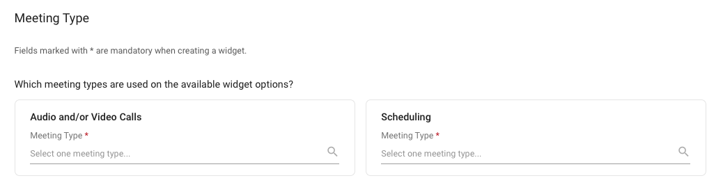 In the *Meeting Type* part of the settings, you can assign a meeting type to both the requested audio/video calls and the scheduled calls. If you don't do anything with scheduling, it will be greyed out, but you will still need to fill it in if visitors are able to schedule a meeting if there are no operators available.