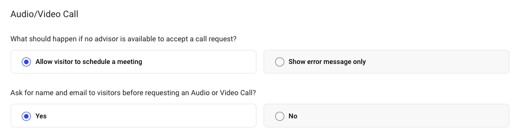 If you include one of the options where the customer can request a call, then you can also select if there should be the option to schedule a meeting if there is no available operator, or to just show the message that there are no available operators at that moment.