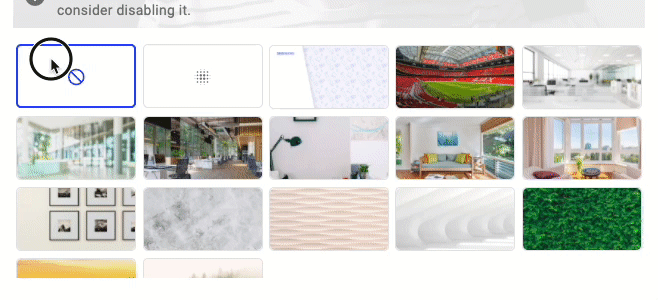 If you want to set up a blurry background, you can click the frame with the blur icon on it. If there are any custom company backgrounds uploaded, they will appear directly to the right of the blurry background. You can click these to select them. You can also select one of the preset images, making you seem like you're in a nice office or even out in nature!&#x20;