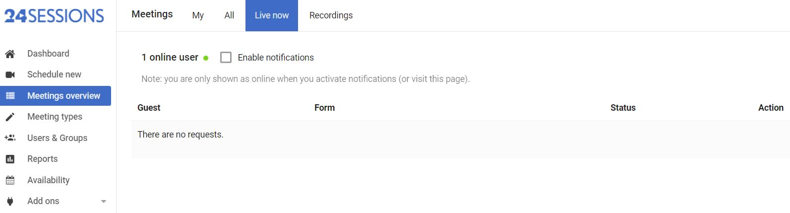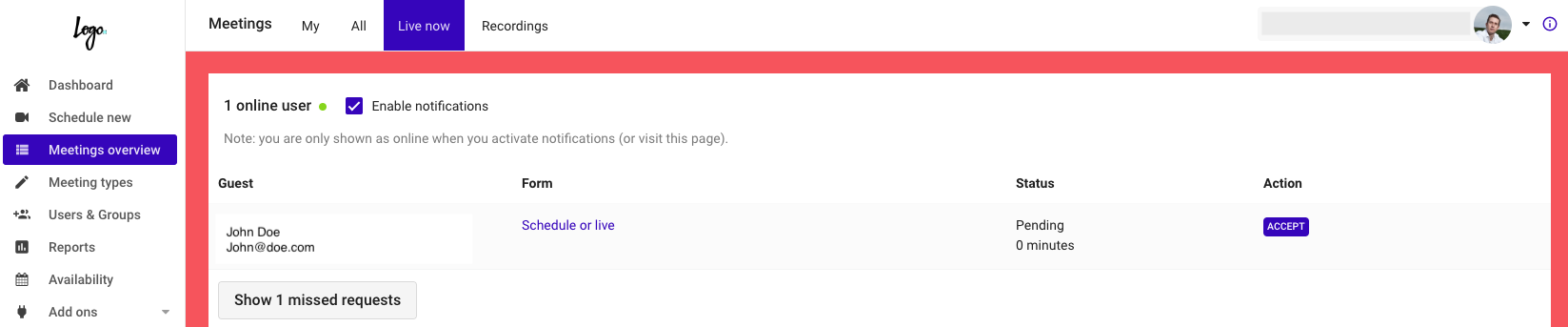 * If you don't have browser notifications enabled you need to be on the 'Meetings Overview - Live Now' page and pick up incoming requests there by clicking the 'Accept' button. &#x20;