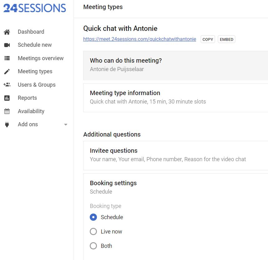 With 24sessions it is possible to hop directly on a video chat session. The feature that gives you the opportunity is called "Live Now." Let's see how you can create a Live now meeting type and how to use this feature.