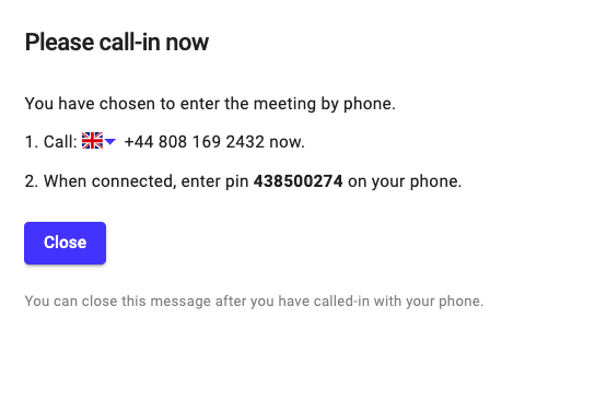This is the fallback option when the guest cannot enter the call, when the connection is suddenly interrupted or when the guest or user has problems with their audio. You can access the feature in the bottom left of the meeting room, clicking the Audio by phone call button.&#x20;
