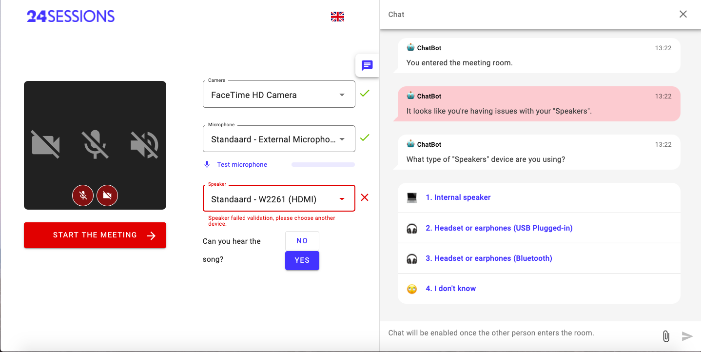 When entering without a microphone or speakers, use the [dial-in](https://24sessions.zendesk.com/hc/en-us/articles/4404457854225-Dial-in) option to establish an audio connection.