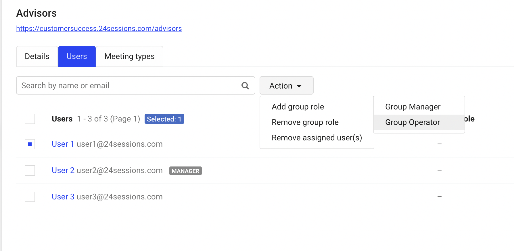 Working with a lot of users can be a headache, luckily 24sessions has a group functionality which makes you able to create groups of users who can have the same meeting or have the same booking link.