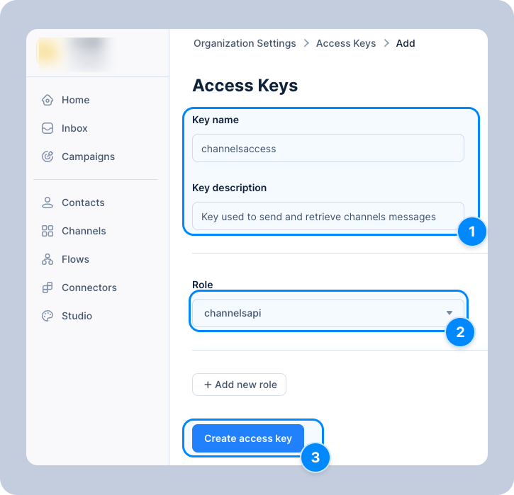 In this example we will create an access key that will attach the access role that was created in the [access roles](https://docs.bird.com/api/access-roles#creating-an-access-role) example