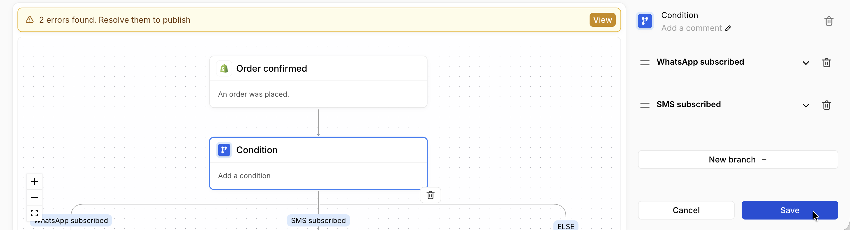 * Set up channel conditions for SMS and WhatsApp subscribers