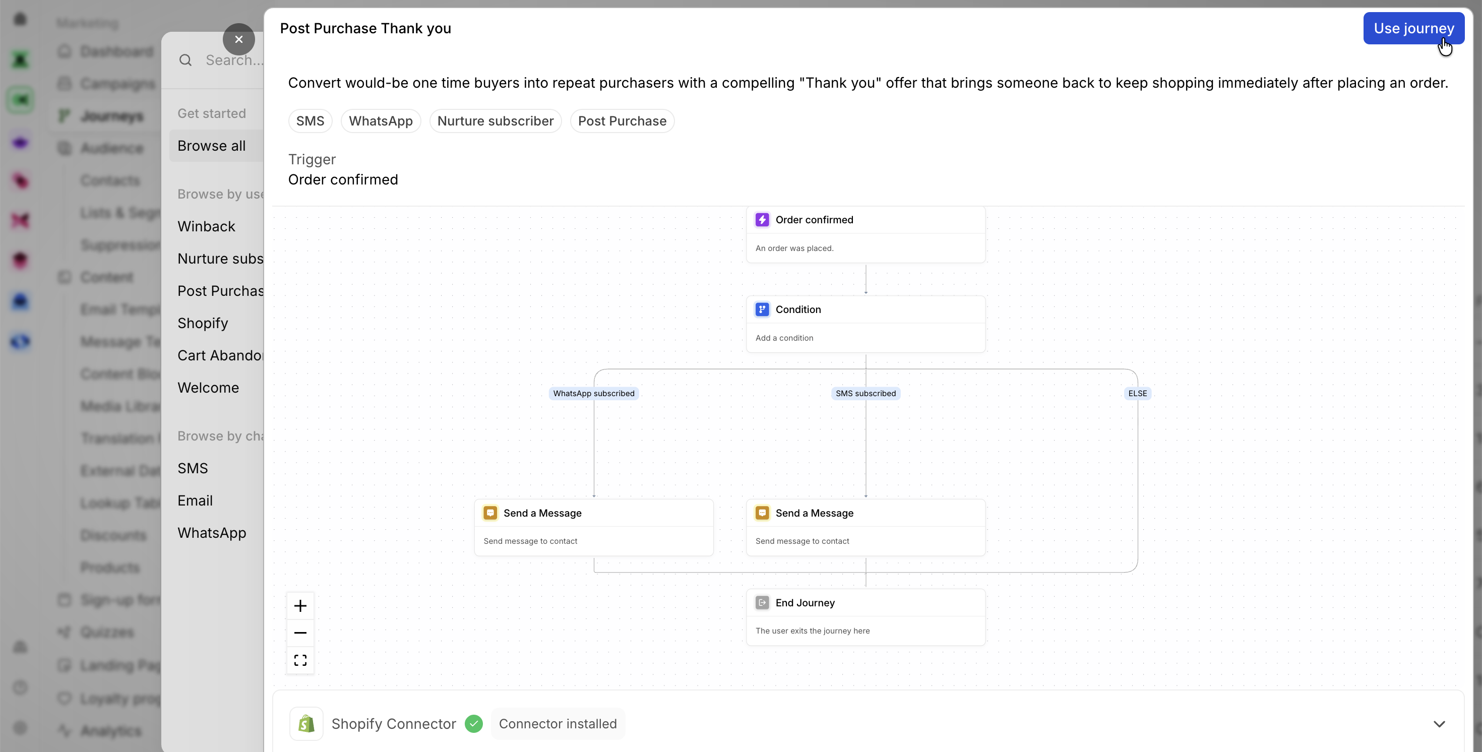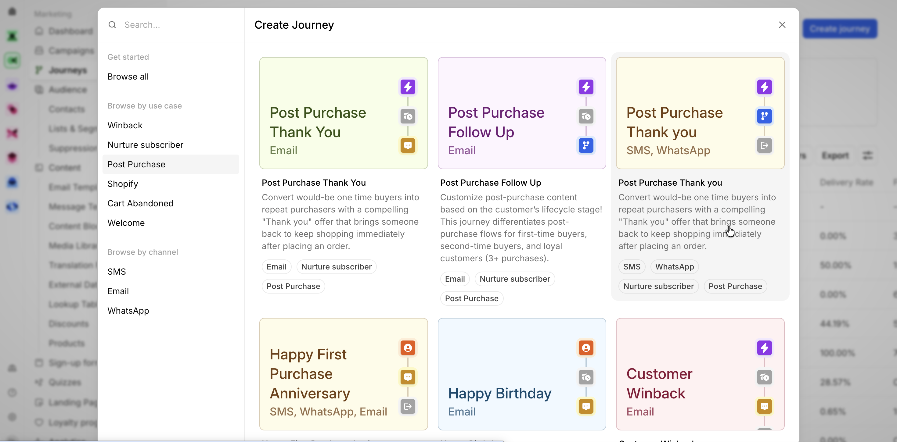 * In the Journey gallery, select the Post-purchase Thank You template for multi-channel (SMS and WhatsApp).