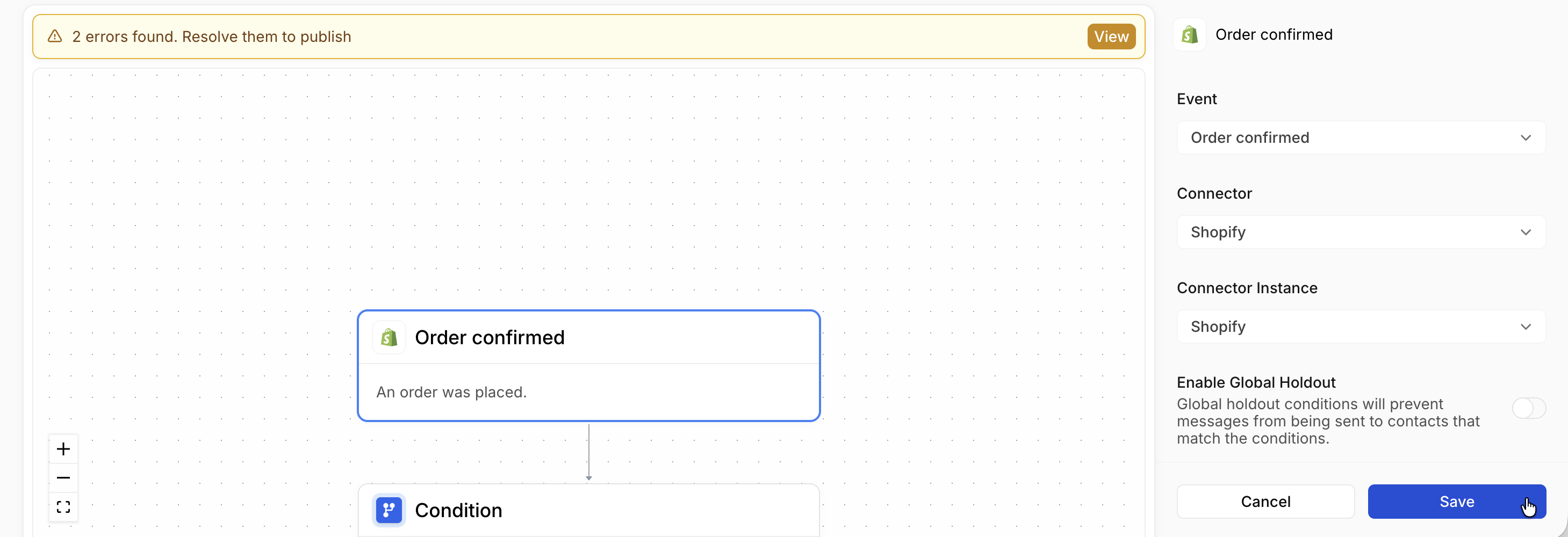 * In the trigger step, select the event that will start the journey: choose **Order Confirmed** from the Shopify event dropdown.