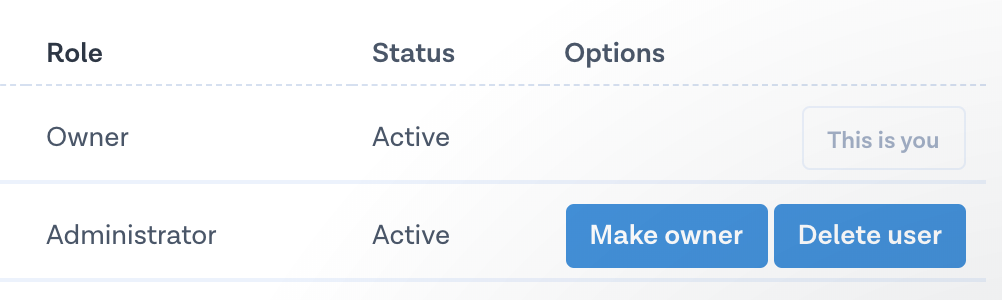On the Users page just click on the ‘Make Owner’ button next to their email address.