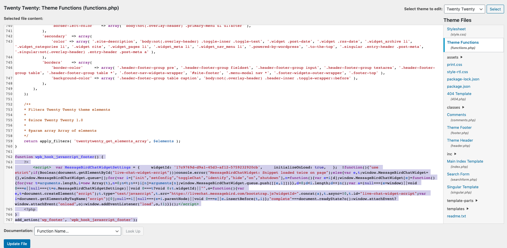 3\. To insert the script to the footer of all pages, Scroll down to the bottom of the file and add the following code.