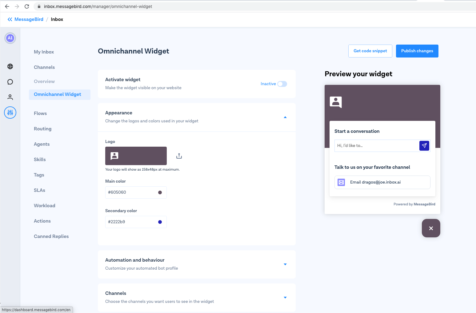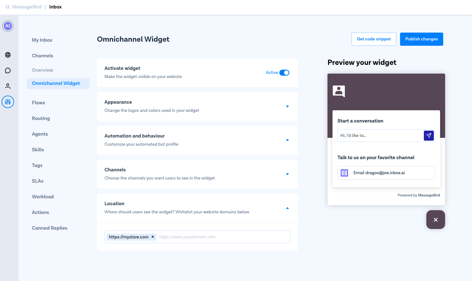 6\. Done? Awesome! Hit **Publish changes** and **activate the widget**. You can always come back and change the [Inbox settings](https://inbox.messagebird.com/manager/overview).