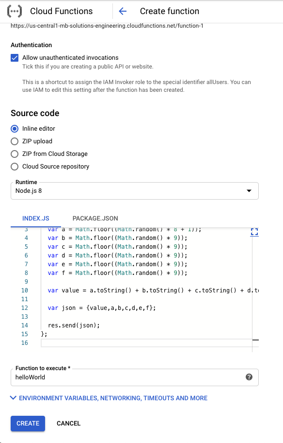 Choose Allow Unauthenticated Invocations — this is for initial testing only.