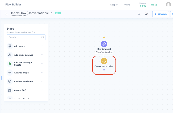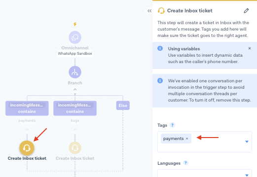17\. Click on each of the ‘Create Inbox Ticket’ steps to configure them, select the respective tags and press ‘Save’ when ready: