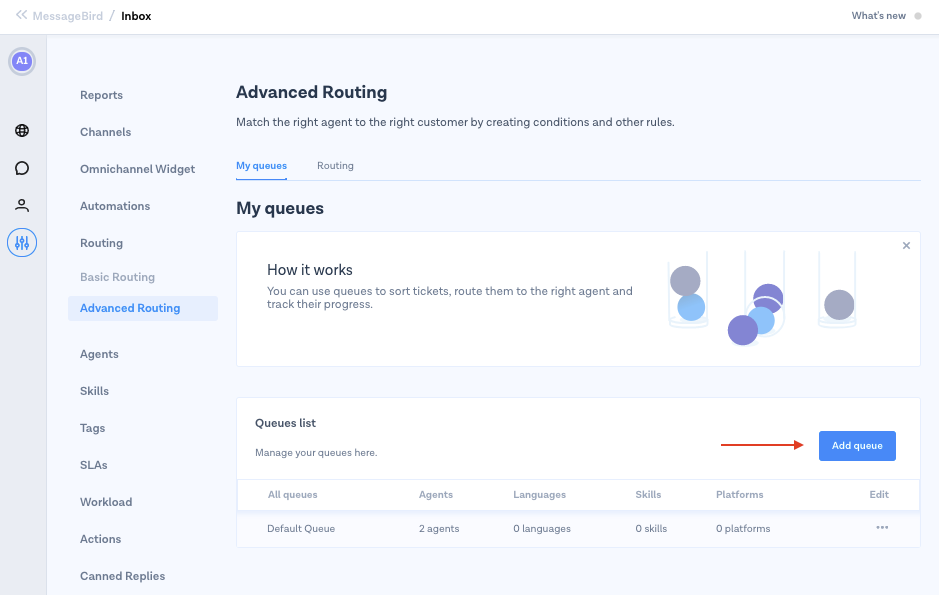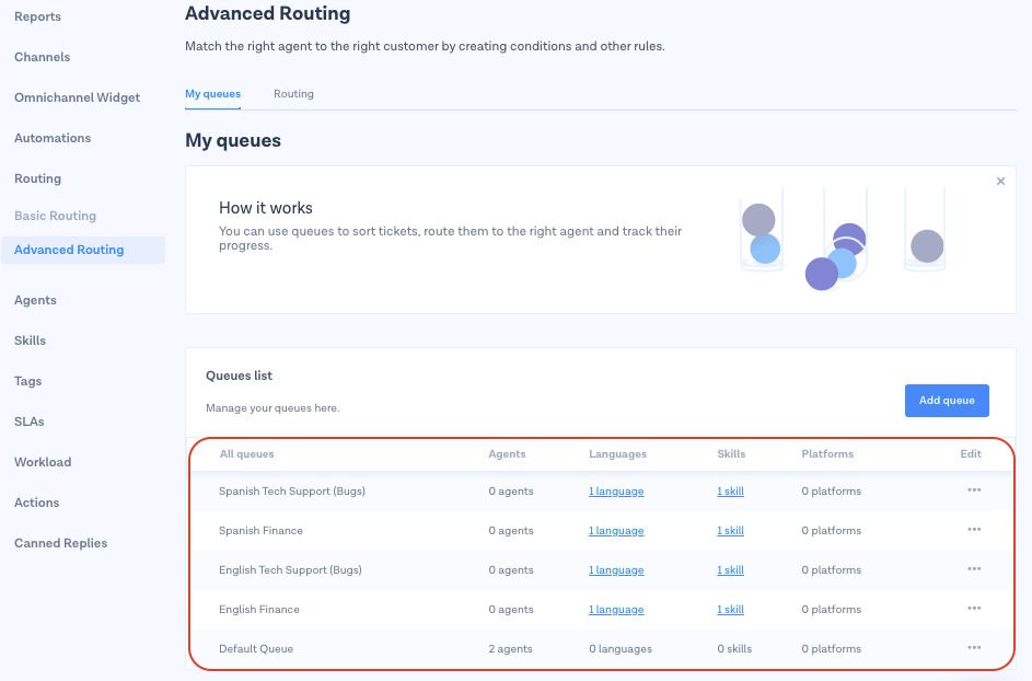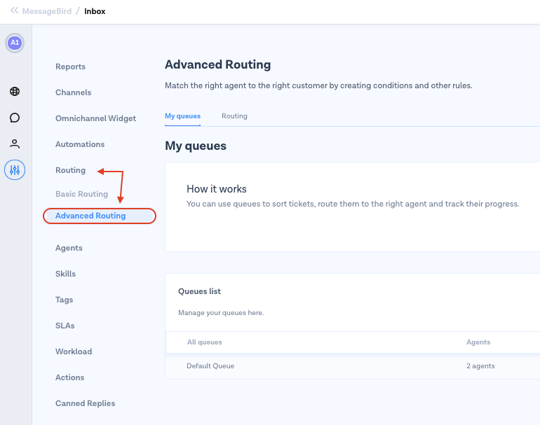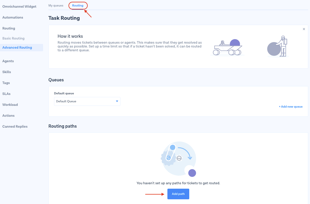9\. Head to the ‘Routing’ page from the sub-navigation and click on ‘Advanced Routing’. You'll see a default queue that has already been created, leave it there—it will make sure all your agents are included in this queue, and it can be a queue towards which tickets get routed as a last resort.