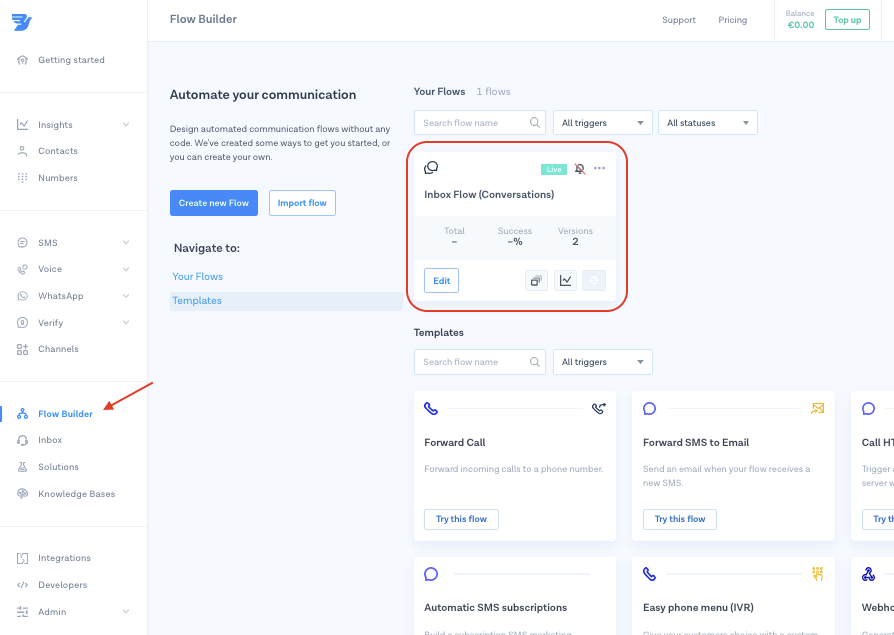 To do that, head to ‘FlowBuilder’ in your Dashboard, and select the 'Inbox Flow' listed in ‘Your flows’ :