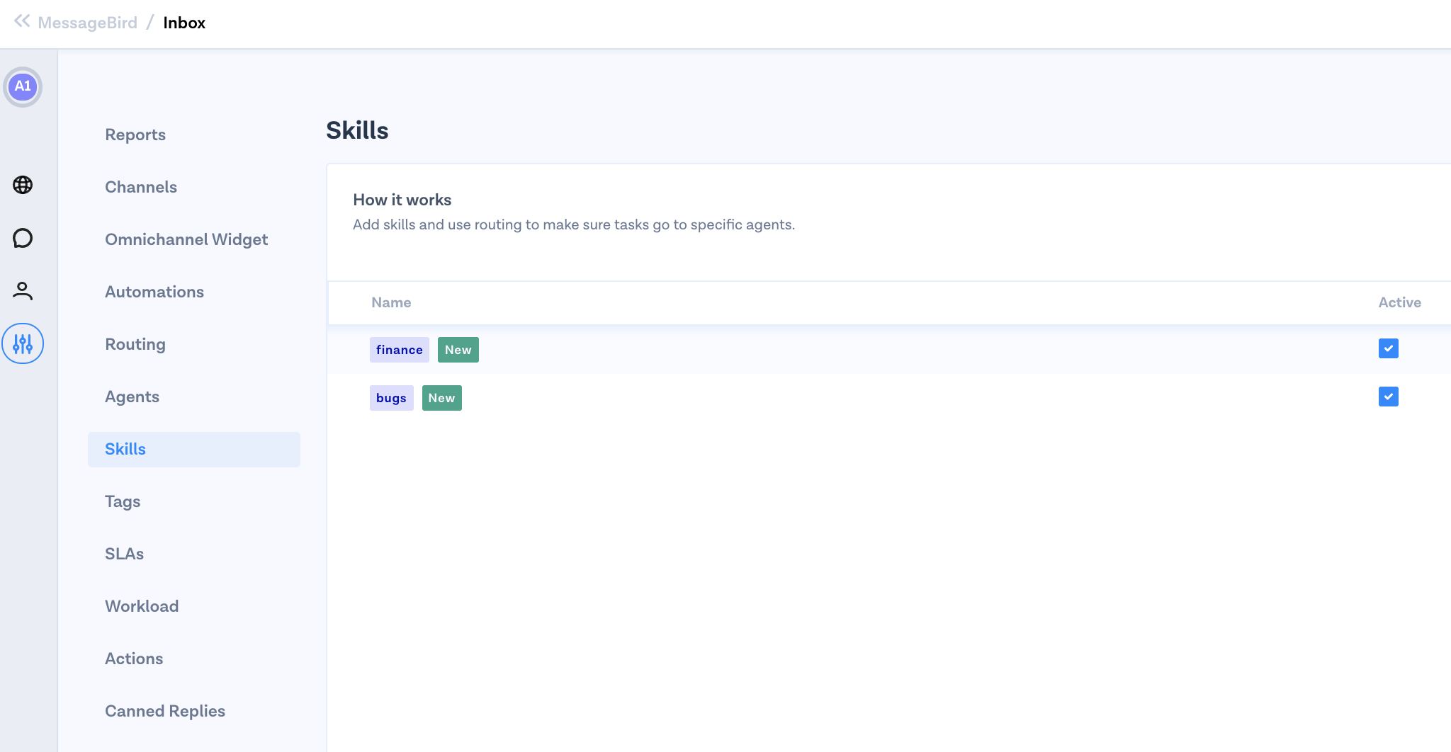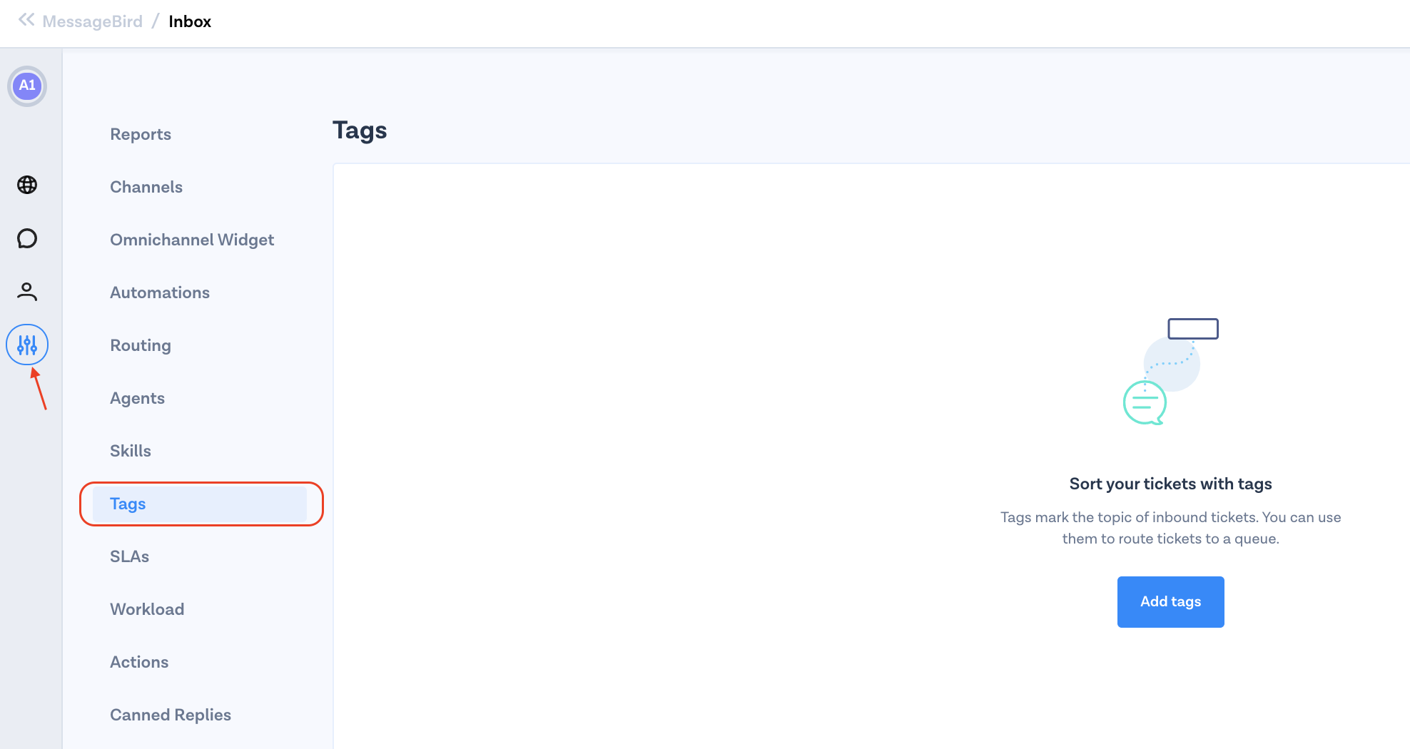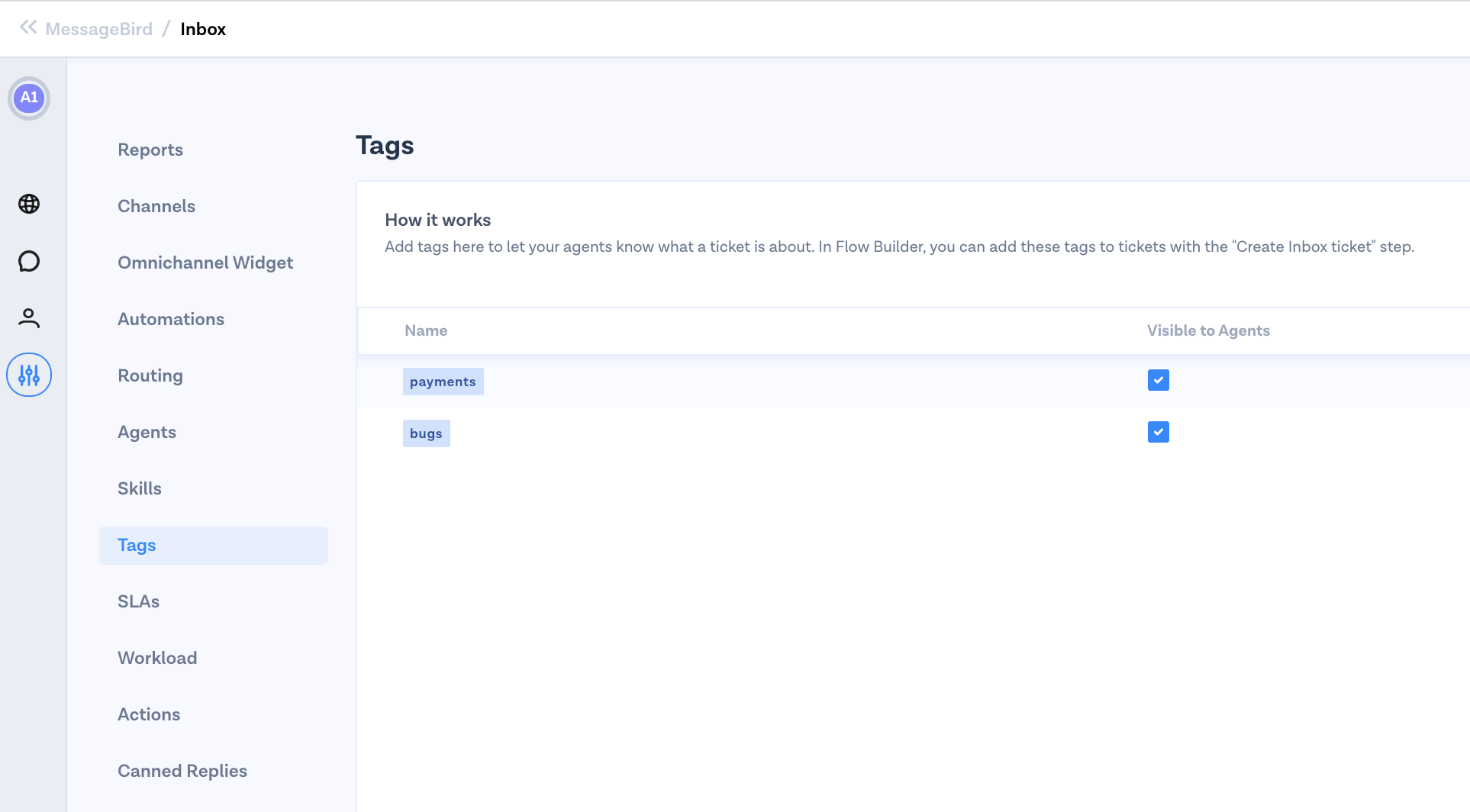 Ready to get started? Let's add some **tags** with which tickets can be identified, and **skills** so the tickets are assigned to the right support agents. Inbox has languages built-in by default, thus we only need to add tags and skills. Let’s call them ‘payments’ for finance and ‘bugs’ for tech-support.