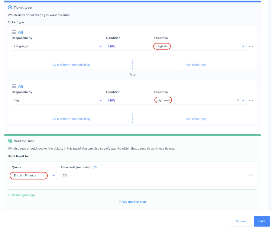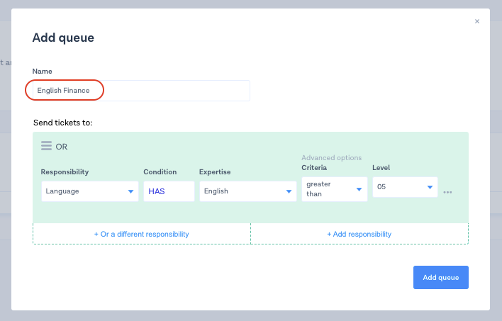 After giving it a name, it’s time to handle the 'Language' condition. Select Language ‘HAS’: English, with a level greater than 5 (to make sure the agents' level of English is good enough):