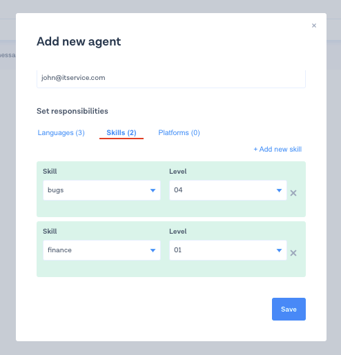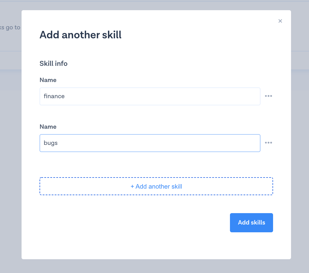 For our example, the first skill is ‘payments’. Then click on ‘+Add another skill’ and add the second skill - ‘bugs’. Just like with tags you can insert multiple skills and save them at the same time!