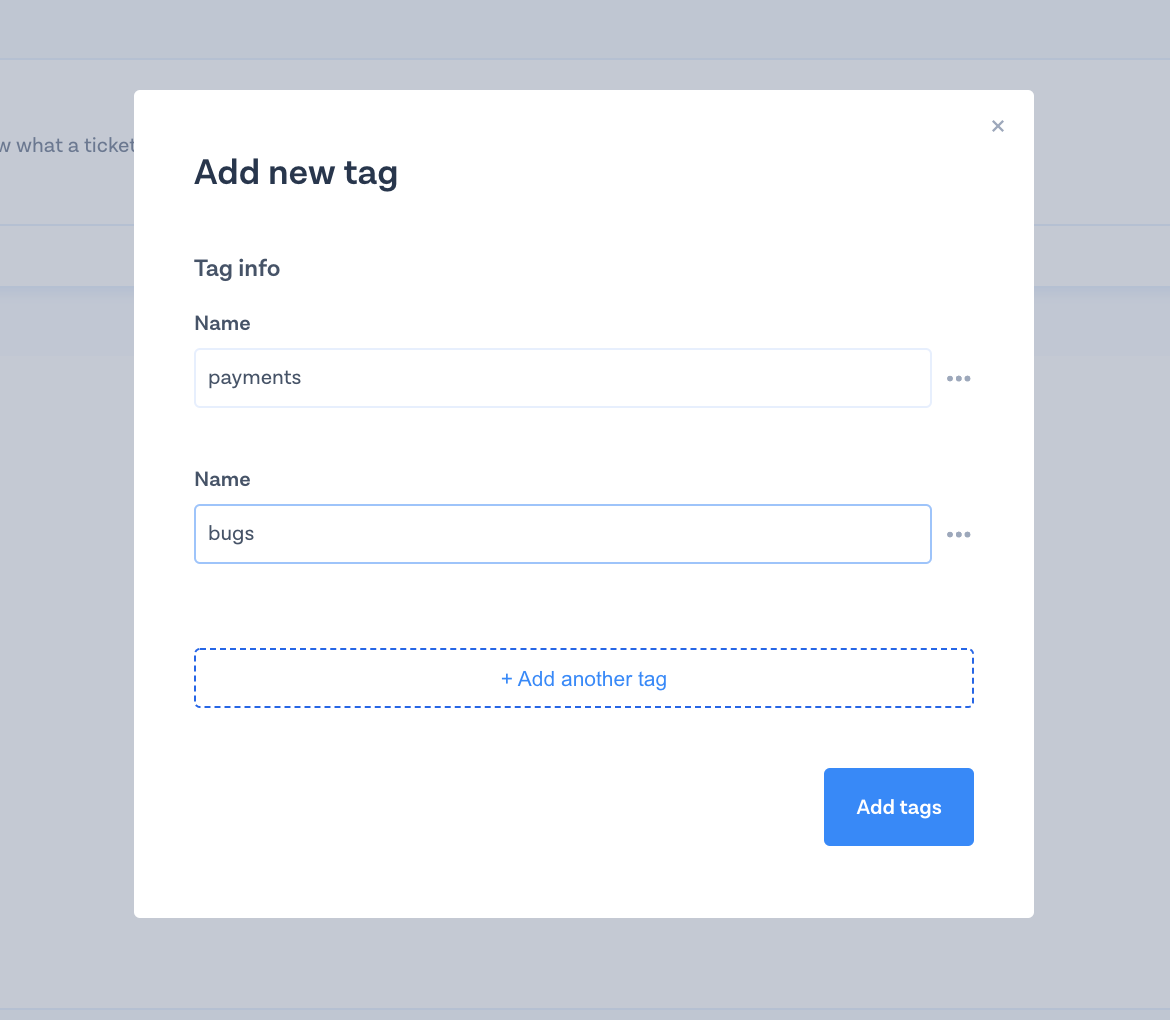 For our example, the first tag is ‘payments’. Then click on ‘+Add another tag’ and add the second tag - ‘bugs’. You can insert multiple tags and save them at the same time!<br>