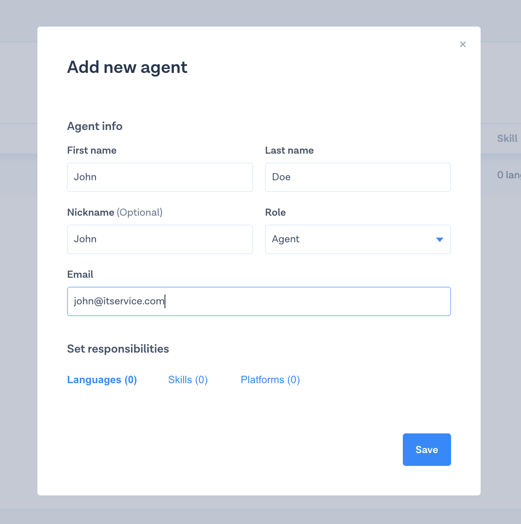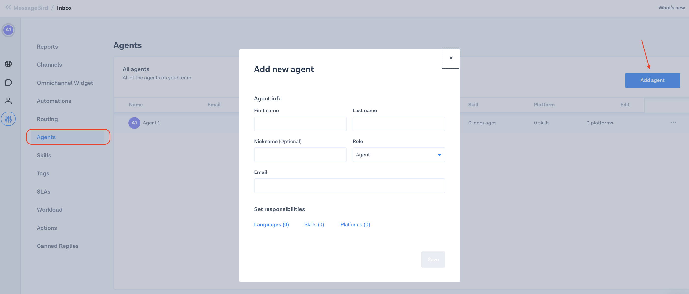 7\. Great! Now we have all the tags and skills that we need. The next step is to add the team. Head to the ‘Agents’ page from the sub-navigation and click on ‘Add agent’. This will take you to the following modal: