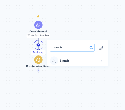 16\. Click on the plus sign 'Add step' (between the 'Omnichannel' and 'Create Inbox ticket' steps) and select the ‘Branch’ step.&#x20;