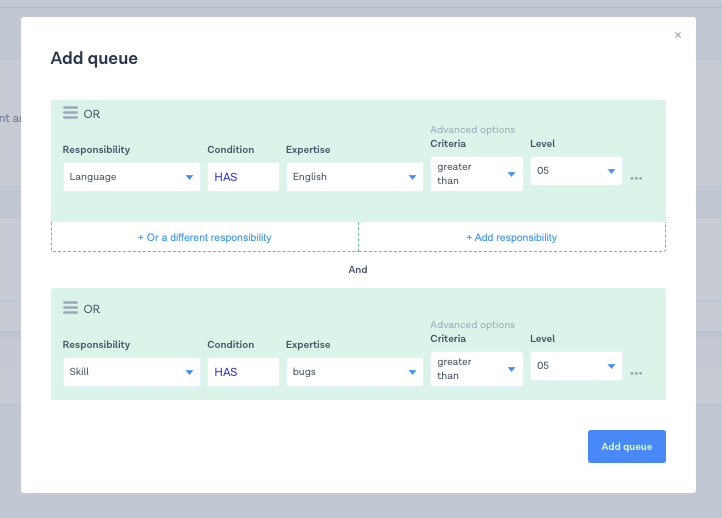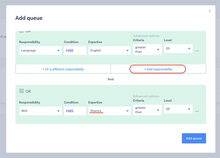 First, click ‘+Add responsibility’ to insert a second condition and follow the same process: