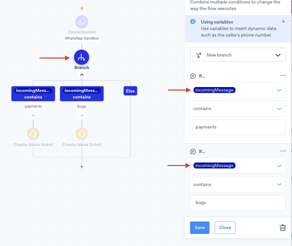 Now you can add multiple conditions for different keywords you would like to be recognized within the flow, such as 'payments', 'bugs' etc.