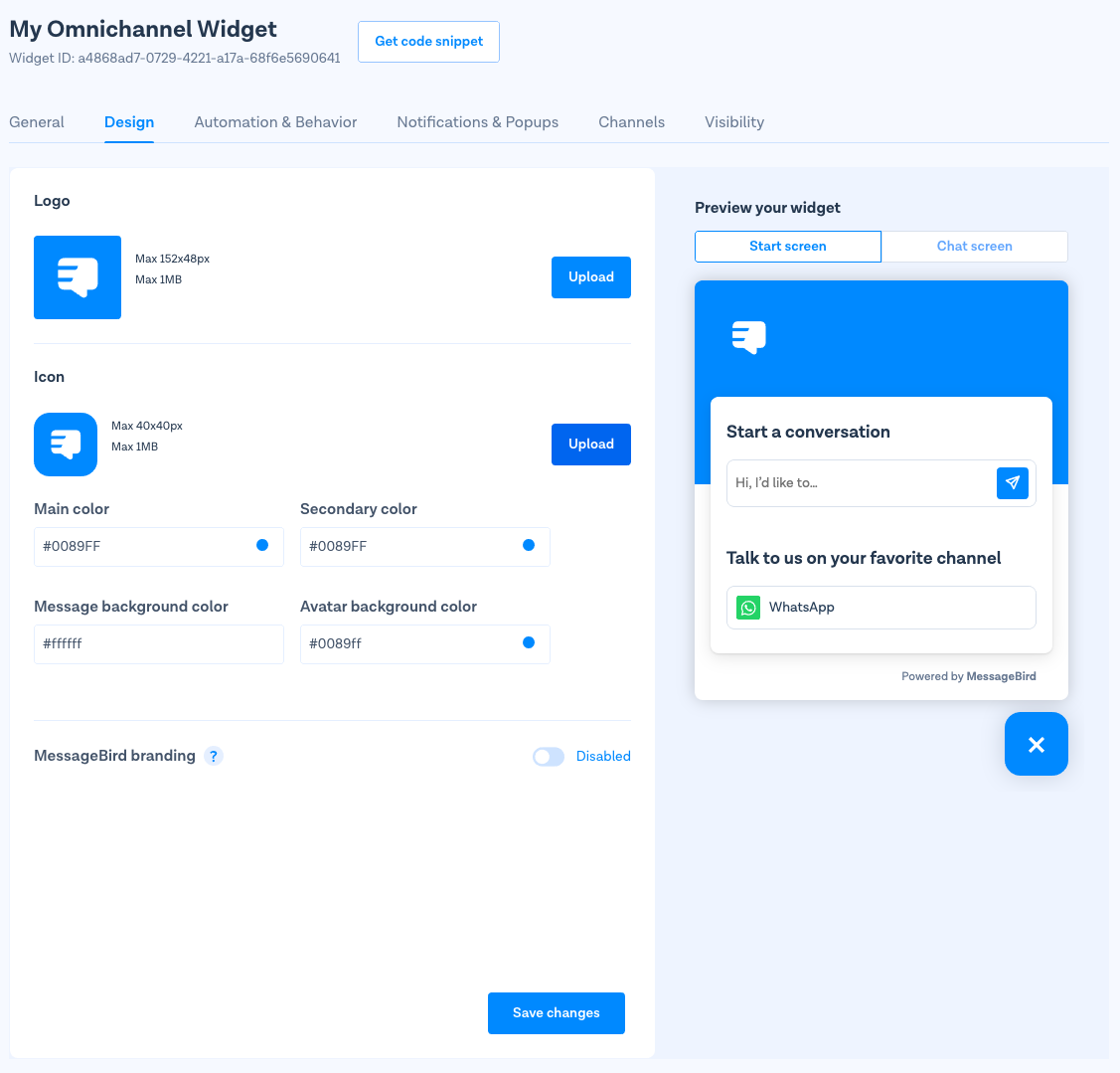 The Omnichannel Widget icon can only be customized if your business is on a [Custom Plan](https://messagebird.com/en/pricing). Please get in touch with your MessageBird Account Manager to unlock this feature, or get in touch with the MessageBird Support Team via our Omnichannel Widget.&#x20;