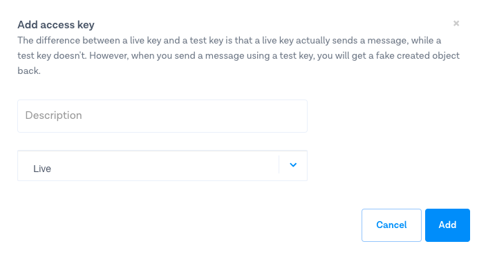 Give your access key a description, for instance 'EmailSMS', and choose 'live' for the key type. Press 'Add' to create the access key for your account. You don't need to do anything with the key besides create it.&#x20;