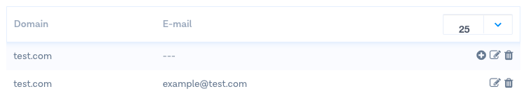 You can set up configurations on domain level by clicking on the notepad on the right side next to the domain name. When you edit on domain level, the settings will apply to all email addresses with that domain name. In the screenshot above, the domain name is 'test.com'.&#x20;