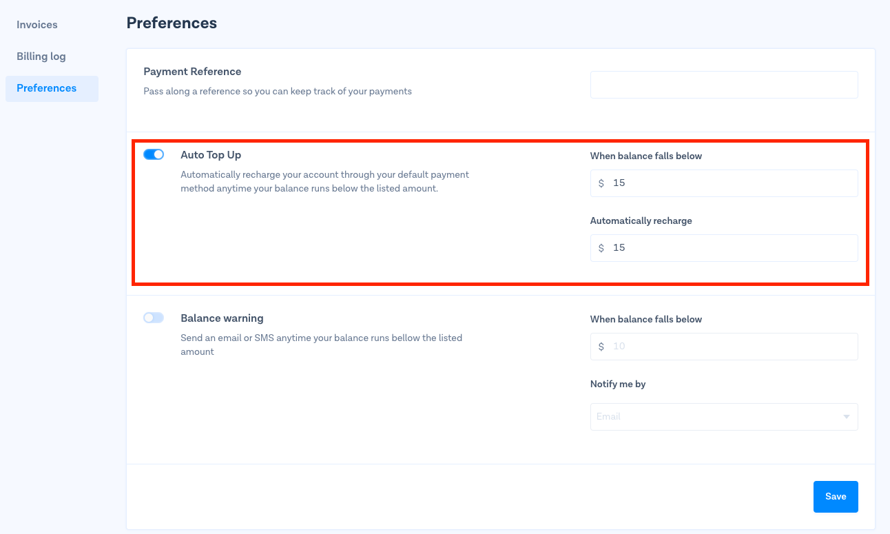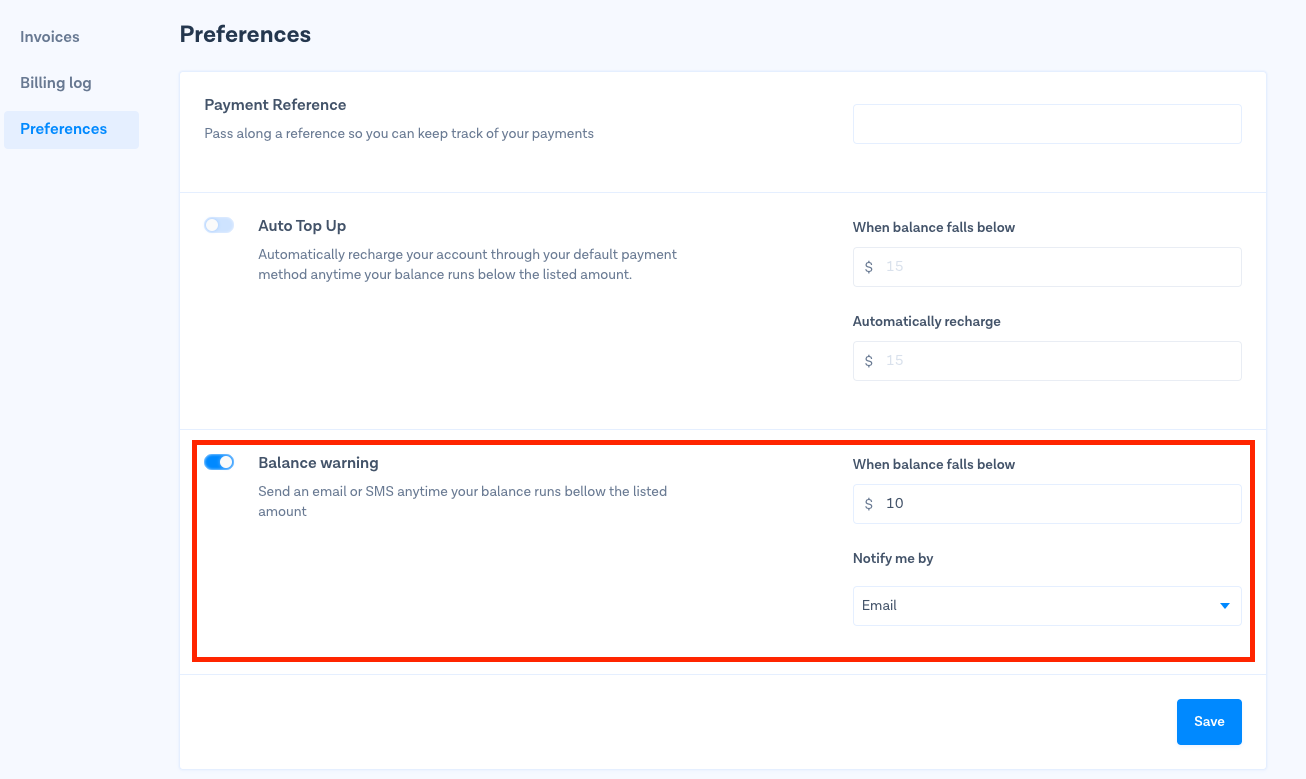 Within [Financial Preferences](https://dashboard.messagebird.com/en-sg/finance/settings) of your workspace, you can set up low balance warnings and create auto-orders.