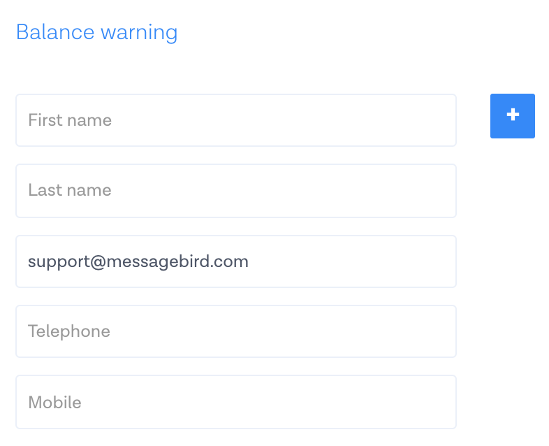 **Tip:** Check & set up your [notification contacts](https://dashboard.messagebird.com/en/settings/notifications#balance) to configure which email address/mobile number you would like us to send these low balance warnings. You can add several contacts, by clicking on the blue '+'&#x20;