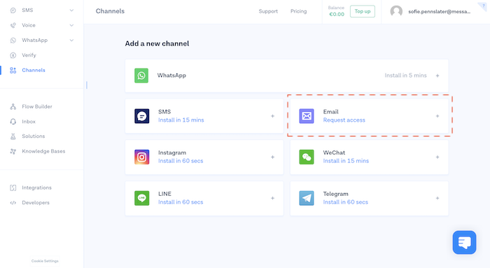 3. Under **Add a new channel**, look for **Email** and click [Request access](https://www.messagebird.com/en/form/email). A form will appear.<br>