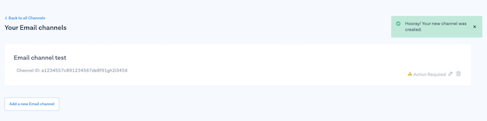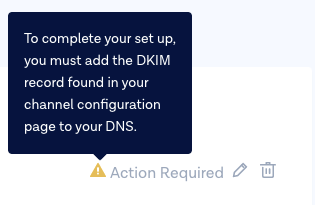 6. There will be an **Action required** warning next to your new Email channel, prompting you to add the DKIM record found in your channel configuration page to the domain DNS. Click on your new **Email channel** to go to the channel configuration page.<br>