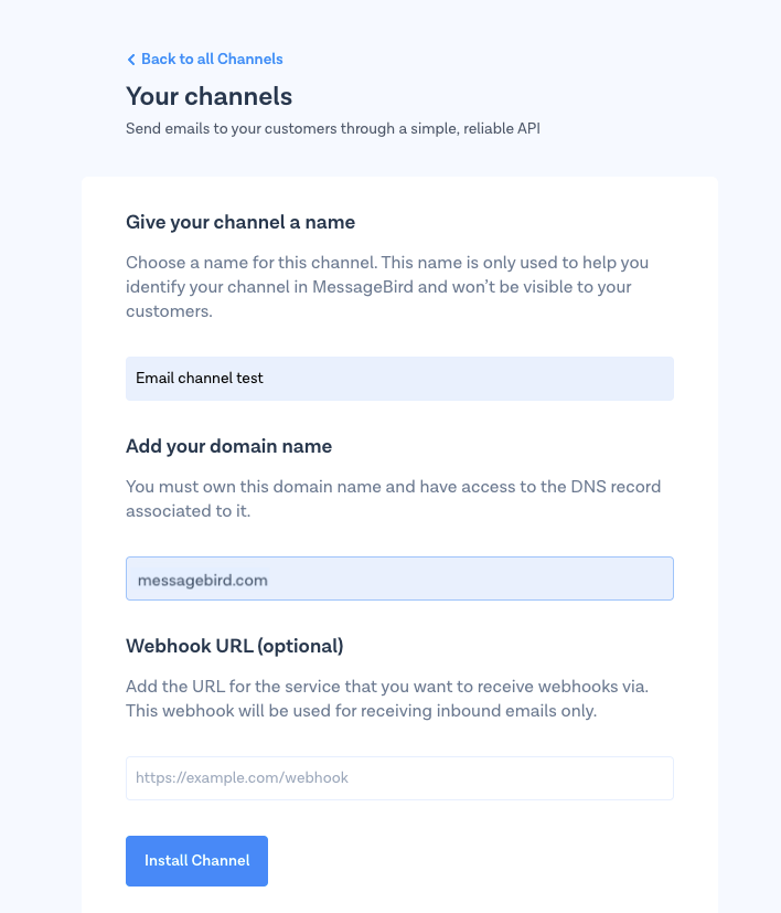 9. That’s it! Now your email channel is active. View your new channel and its status on the [Channels](https://dashboard.messagebird.com/en/channels) page.