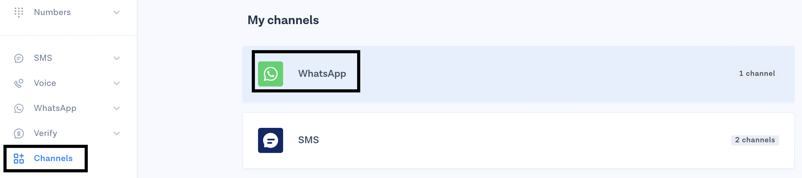 &#x20;1\. Go to the [**Channels** tab](https://dashboard.messagebird.com/en/channels/whatsapp) of your MessageBird Dashboard and click on your **Whatsapp** channel.