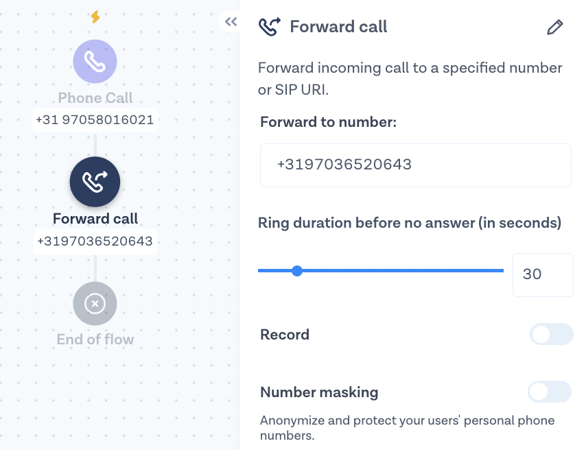2\. Fill in the phone number information in the **Phone Call** step. Then, populate the ‘Forward to number’ field in **Forward Call** and, if necessary, set up the step’s additional options. If you need further information on how to do this, please check our ['Forwarding Call’ article. ](https://support.messagebird.com/hc/en-us/articles/360001844337-Forwarding-Call)