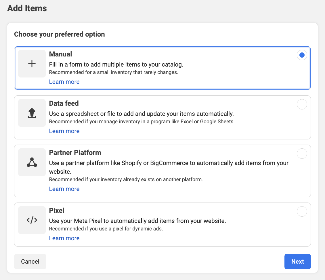 As seen from the screenshot, Meta Commerce Manager supports various ways of adding multiple products. It can be done **manually**, through a **data feed**, **automatically** from **supported partner platforms**, or using **Meta Pixel**.