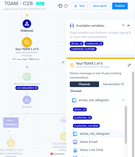 8. Go to the **Set variables** step. This flow is set up to fetch the driver **TelegramID**, which it is assumed you have collected and stored at a previous stage, such as during the driver onboarding. For demonstration purposes, just add your **TelegramID**, which you can fetch using our conversation API. **Save** the step