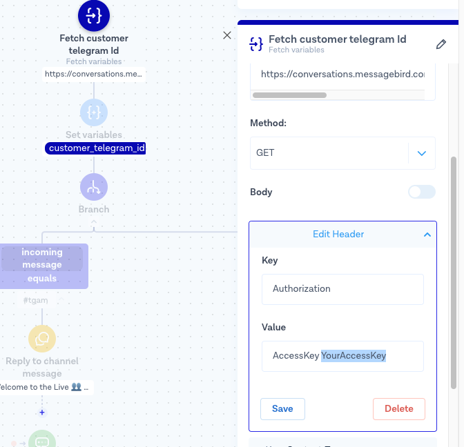 7. Because the customer will start the conversation, the customer Telegram ID can be retrieved via our conversation API. Go to the **Fetch customer telegram ID** step and add your MessageBird access key in the Authorization header<br>