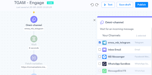4. Go to the **Omni-channel step** and select your Telegram channel from the menu<br>