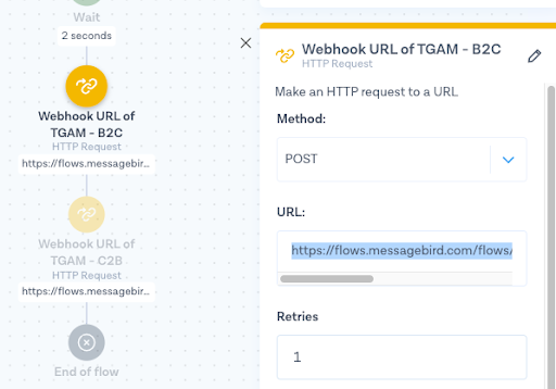 5. Go to the **Webhook URL of TGAM - B2C** step and replace the URL with the TGAM B2C URL you copied in step one. **Save** the step<br>