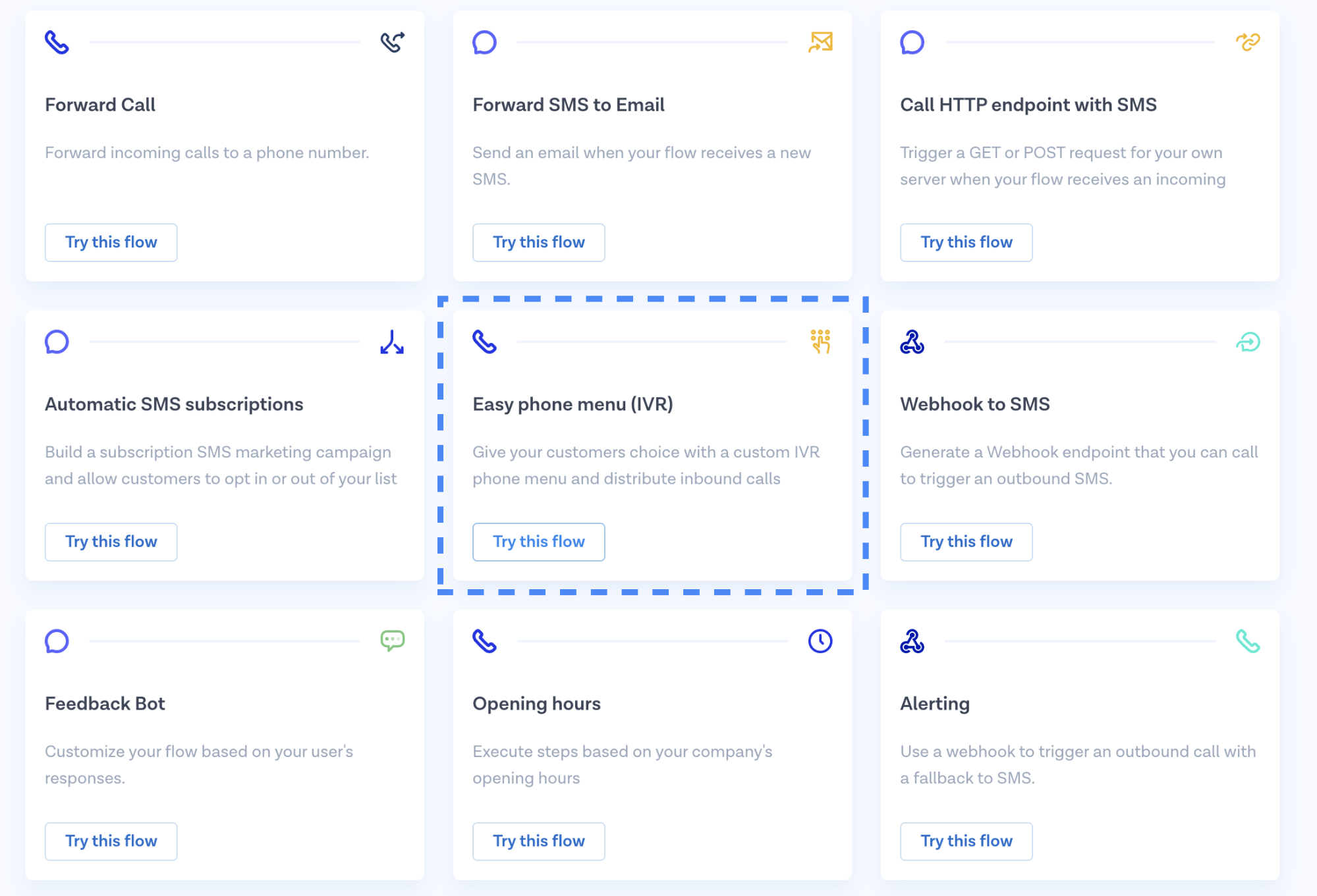 To get started, head to [Flow Builder Templates](https://dashboard.messagebird.com/en/flow-builder#templates), and select the **Easy Phone Menu (IVR).**