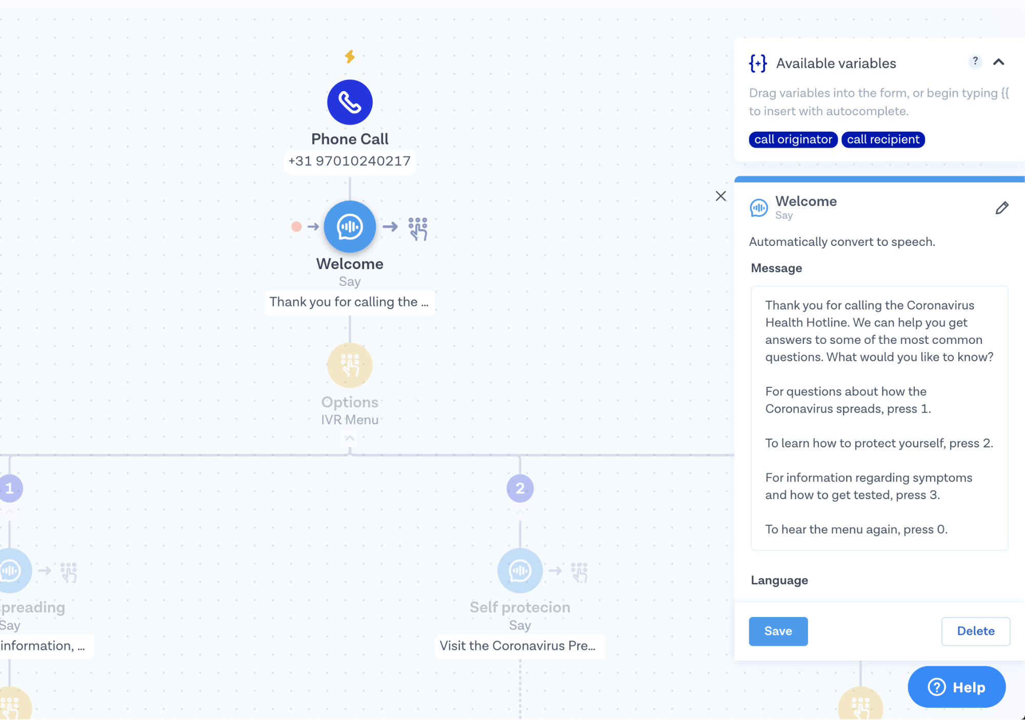 Each step has a configuration panel, which opens when you click on the step bubble. That's where you can edit the content of the message, the language and voice it's read in, the possible options for caller's key presses, and more.