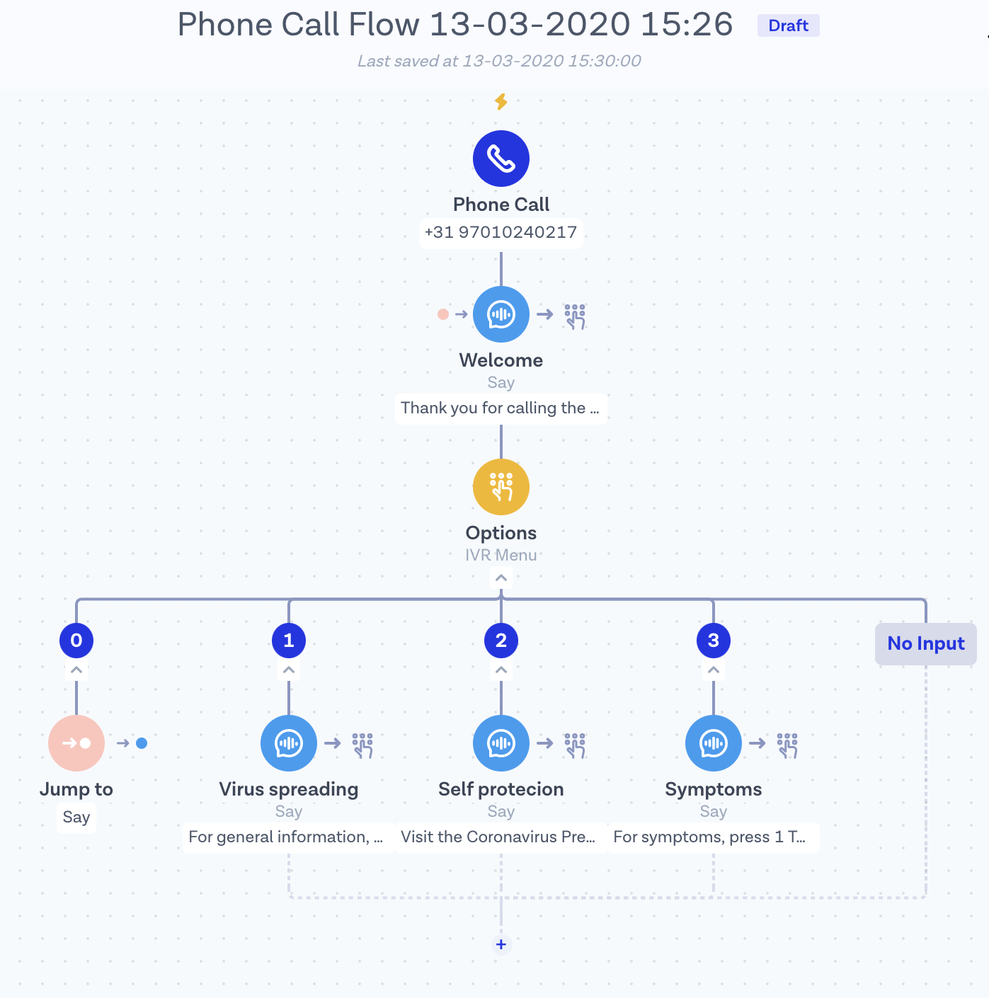 [Flow Builder](https://dashboard.messagebird.com/en/flow-builder) is a drag and drop tool which lets you build custom communication flows, based on the channel of your choice. The image below illustrates an example of such a flow, initiated by a phone call coming into a specific number. Below you see steps that welcome the caller with a text-to-speech message and present a set of options to them, which make sure they're able to get to answers to specific questions.&#x20;
