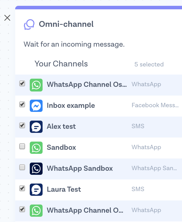 Click the **Omni-channel** step. A list with all your channels will be displayed on the right side of your screen. The channels that have a **✓** are connected to Inbox; those that don’t have a **✓** are not connected. For example, **WhatsApp Channel Os** is connected to Inbox and **Sandbox** is not connected: