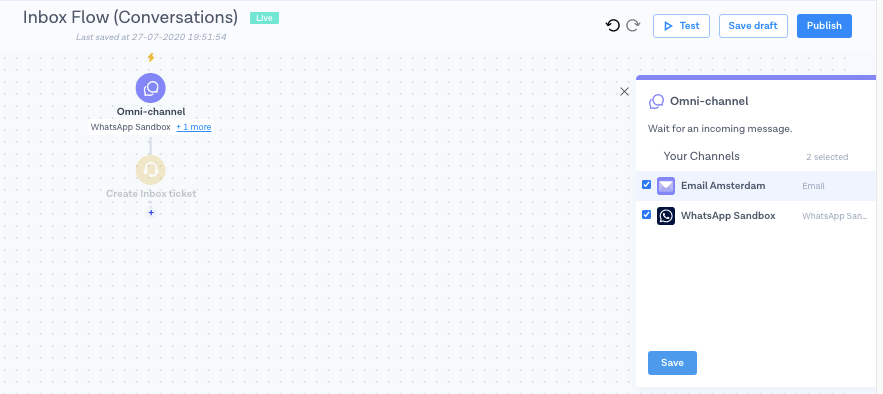 Go to [Flow Builder](https://dashboard.messagebird.com/en/flow-builder) and add your new email channel to the **Inbox Flow (Conversations)** Flow, then hit **Publish**.